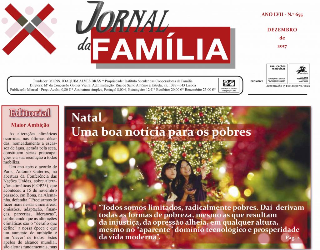 É a última edição de 2017. Brevemente chegará a casa dos assinantes a edição de dezembro do Jornal da Família. O mês de dezembro está aí e com ele chega a vivência de uma das épocas mais marcantes do calendário litúrgico: a vivência do Advento e do Natal. Mas este é também um tempo significativo para […]
